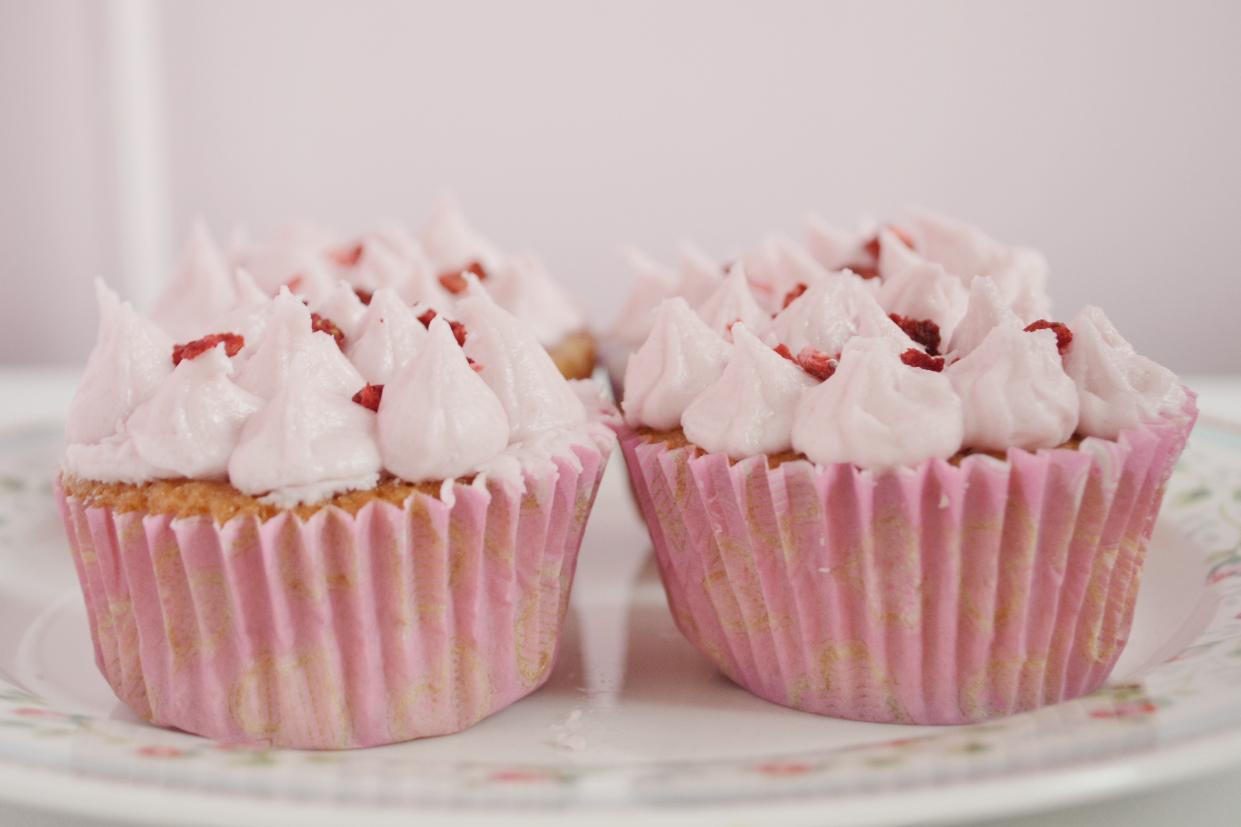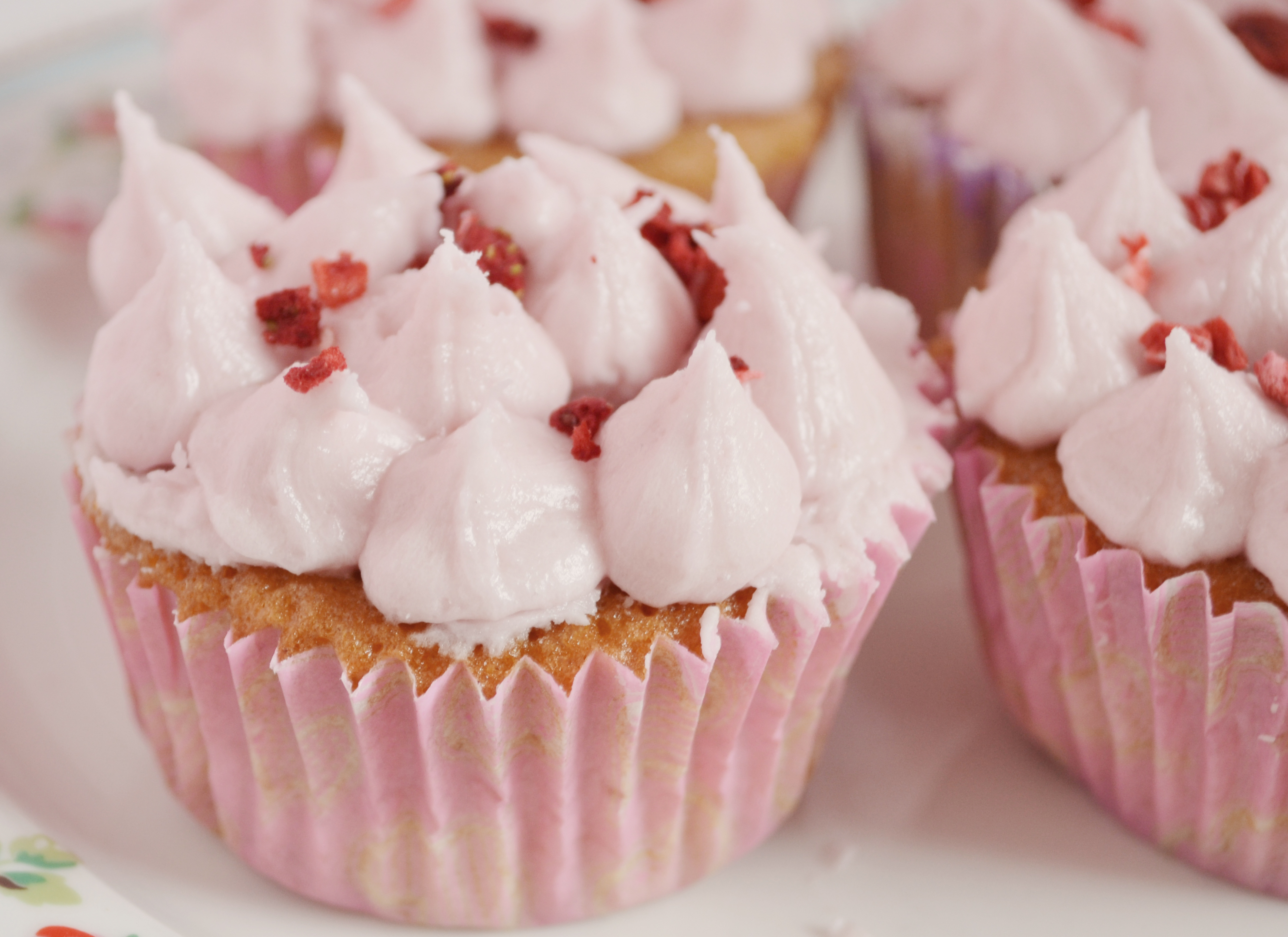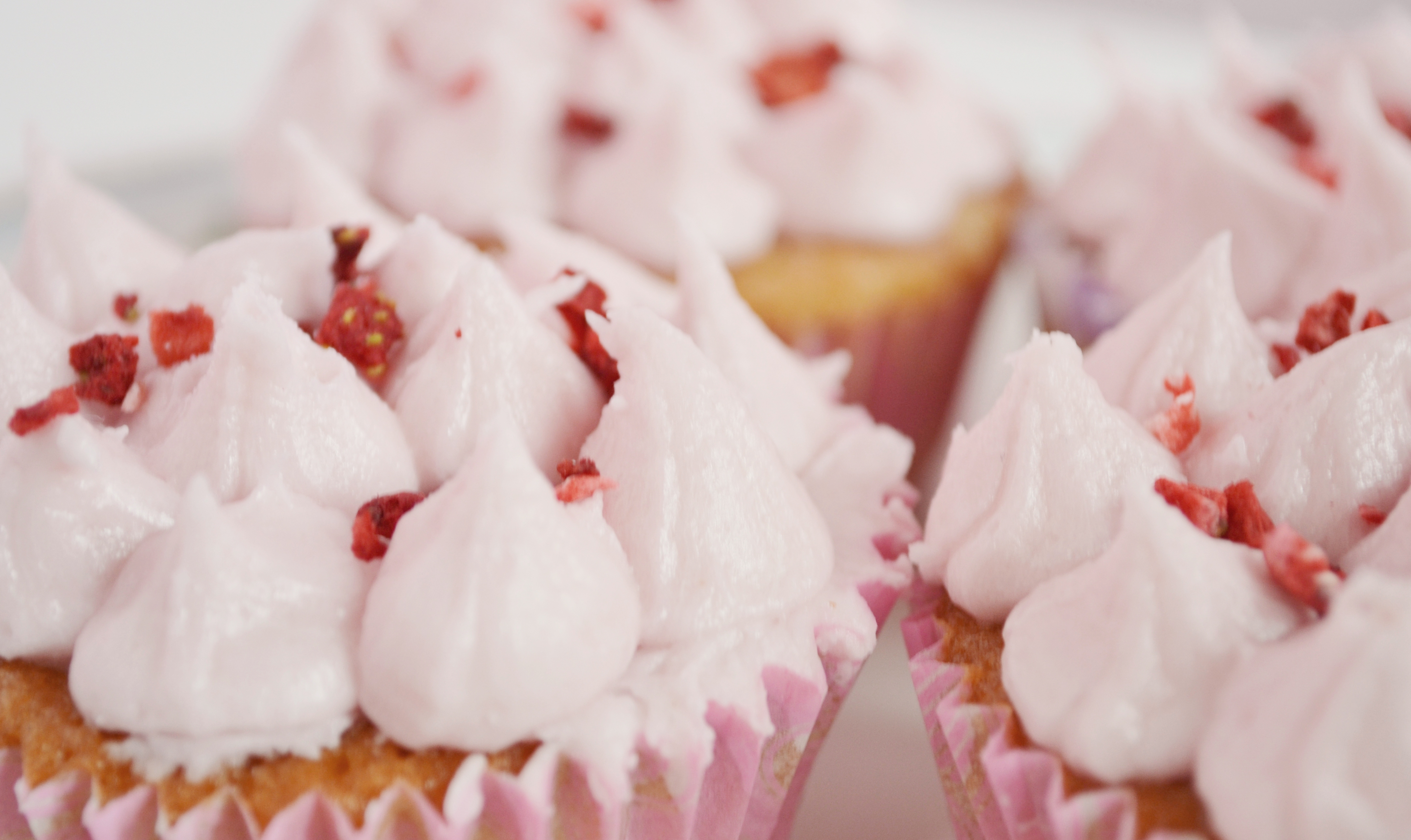 If you are familiar with the Hummingbird Bakery you may know that they tend not to pipe their icing preferring to smooth it on with a pallete knife, I however cannot resist a bit of piping I think it gives it a great finish to a cupcake. I decided to pipe little peaks rather than a swirl as it kinda makes it look more like a strawberry, I also added some freeze dried strawberries sprinkled it onto the top to finish it off.