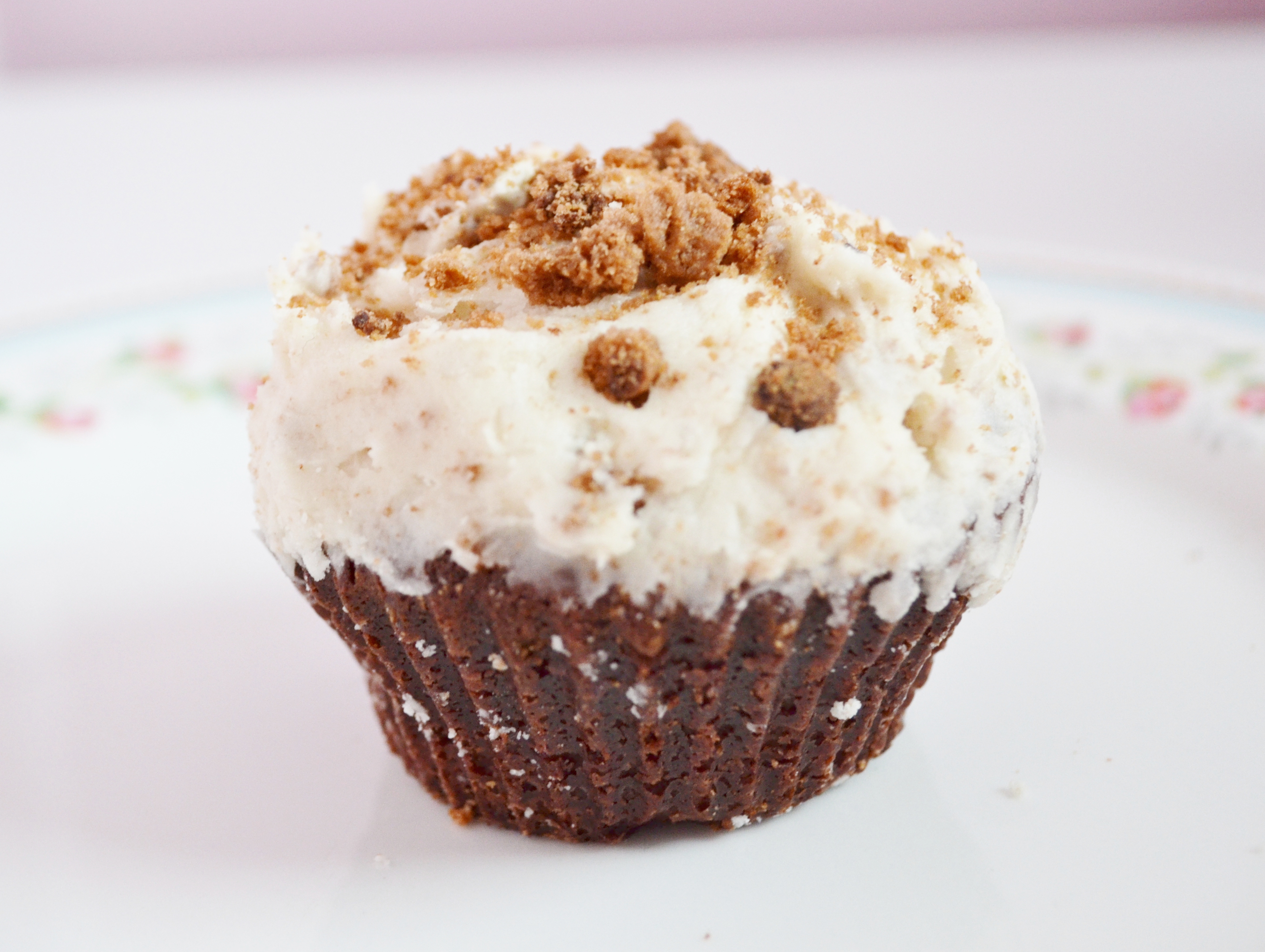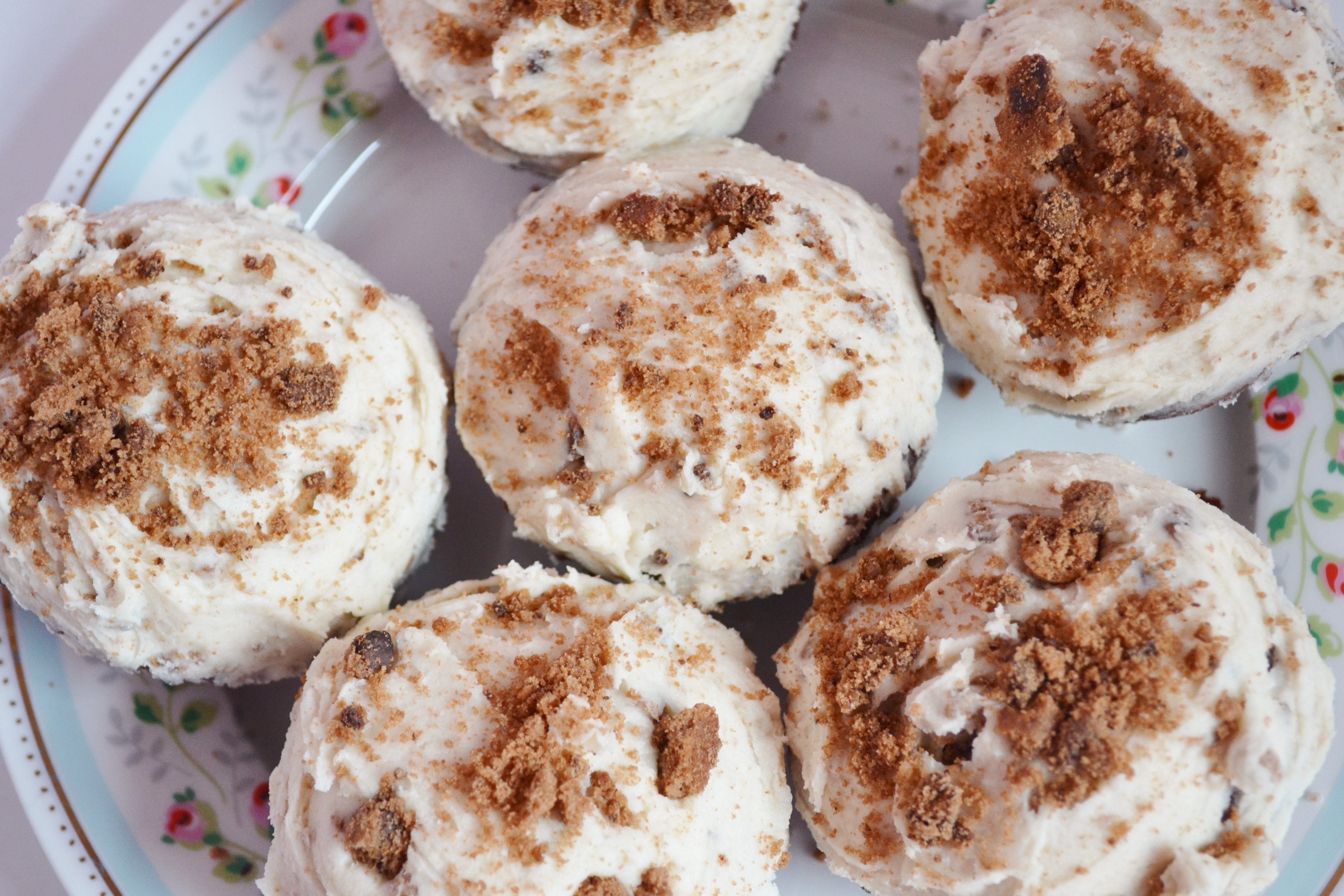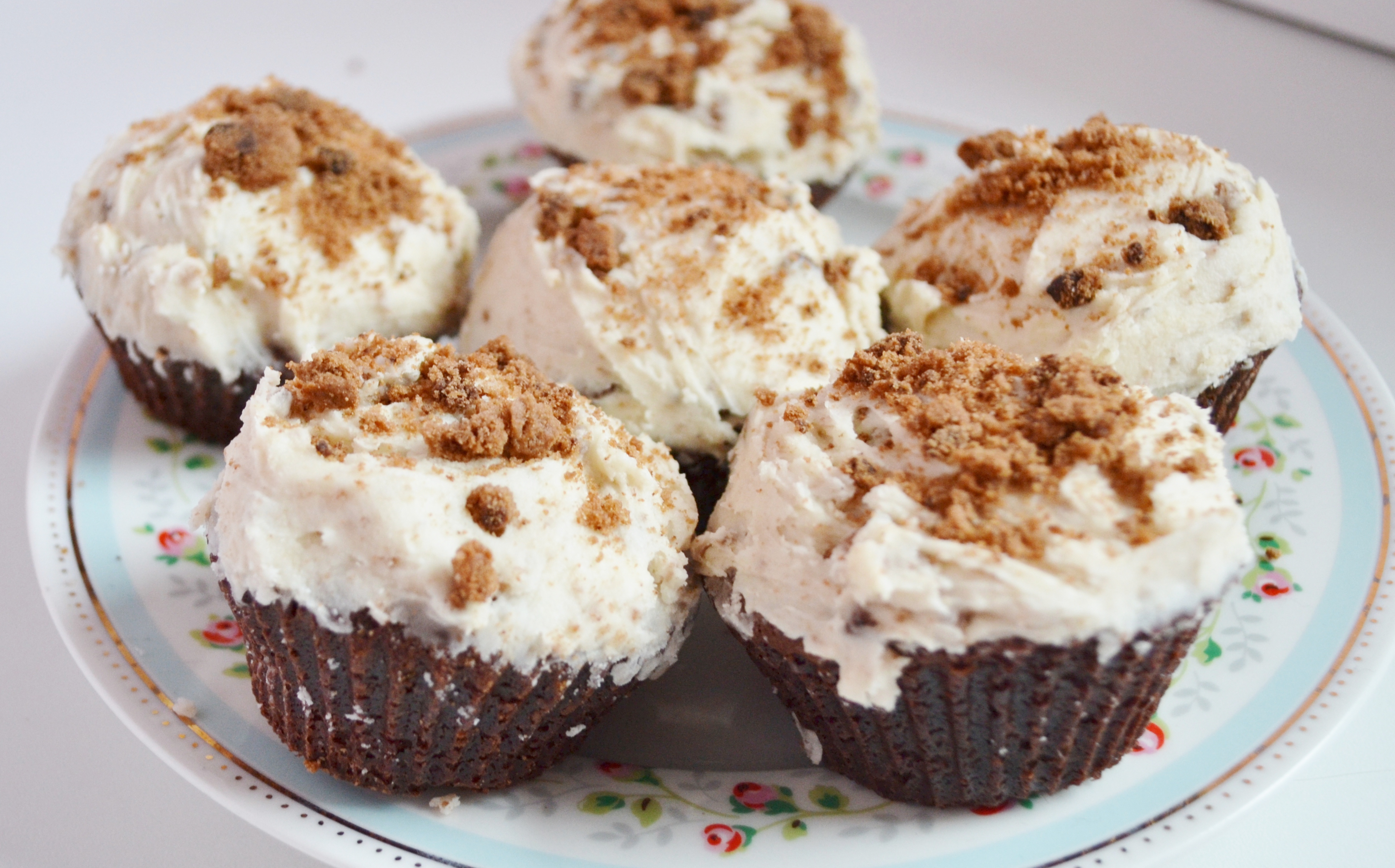 The frosting is a simple butter icing with about 8 more of the cookies bashed up and mixed through. I wanted to pipe these but because of the biscuit crumbs it was almost impossible to do. So instead I piled the icing on with a pallete knife. To finish sprinkle some more of the biscuit crumbs. These I warn you are so yummy you will not want to stop at eating just one. The crunch of the biscuit in the icing and in the cake is amazing!