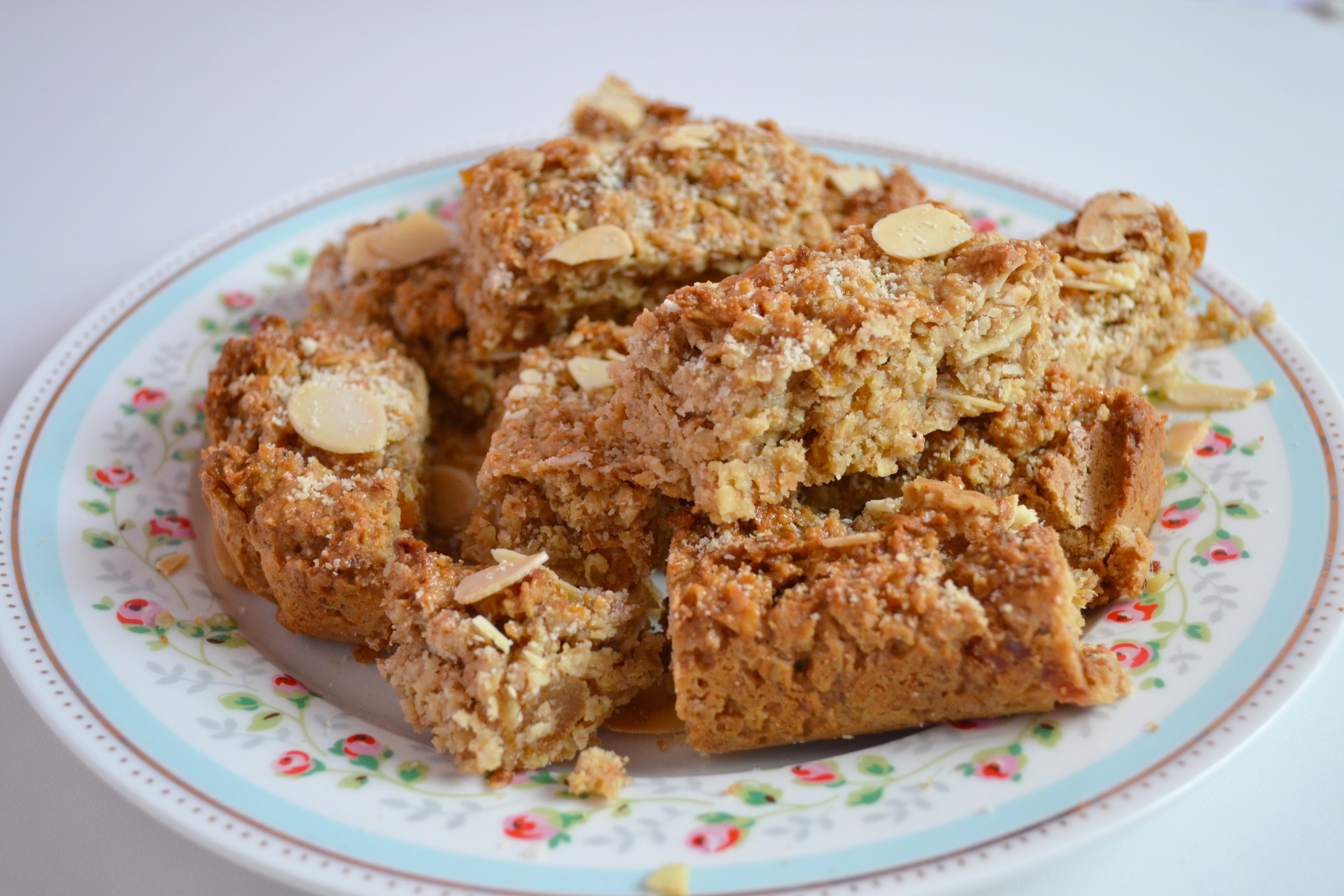 I knew I would have to make some adaptions when I realised I didn’t have any golden syrup or brown sugar. I love almonds and thought it would be a great addition to the recipe, I used both ground and flaked almonds. Instead of golden syrup I used honey, and instead of brown sugar I used regular granulated sugar.