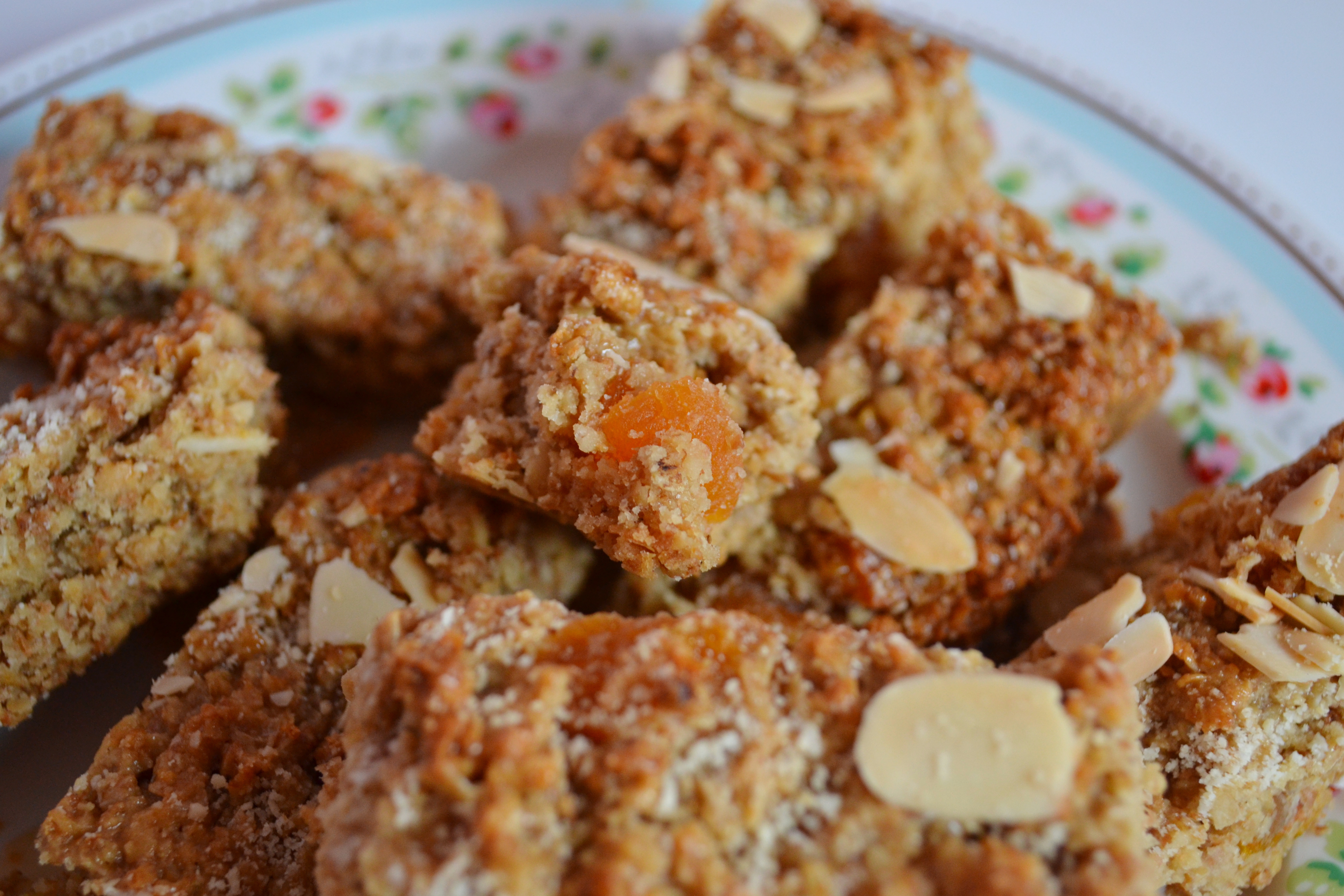 I melted the butter, honey and sugar in a saucepan, and then added the oats, dried apricots, ground and flaked almonds. Once it was all mixed in I pressed into a 20cm square cake tin sprinkled some flaked and (a little) ground almonds on the top and baked it on 180’c for about 25 minutes.
