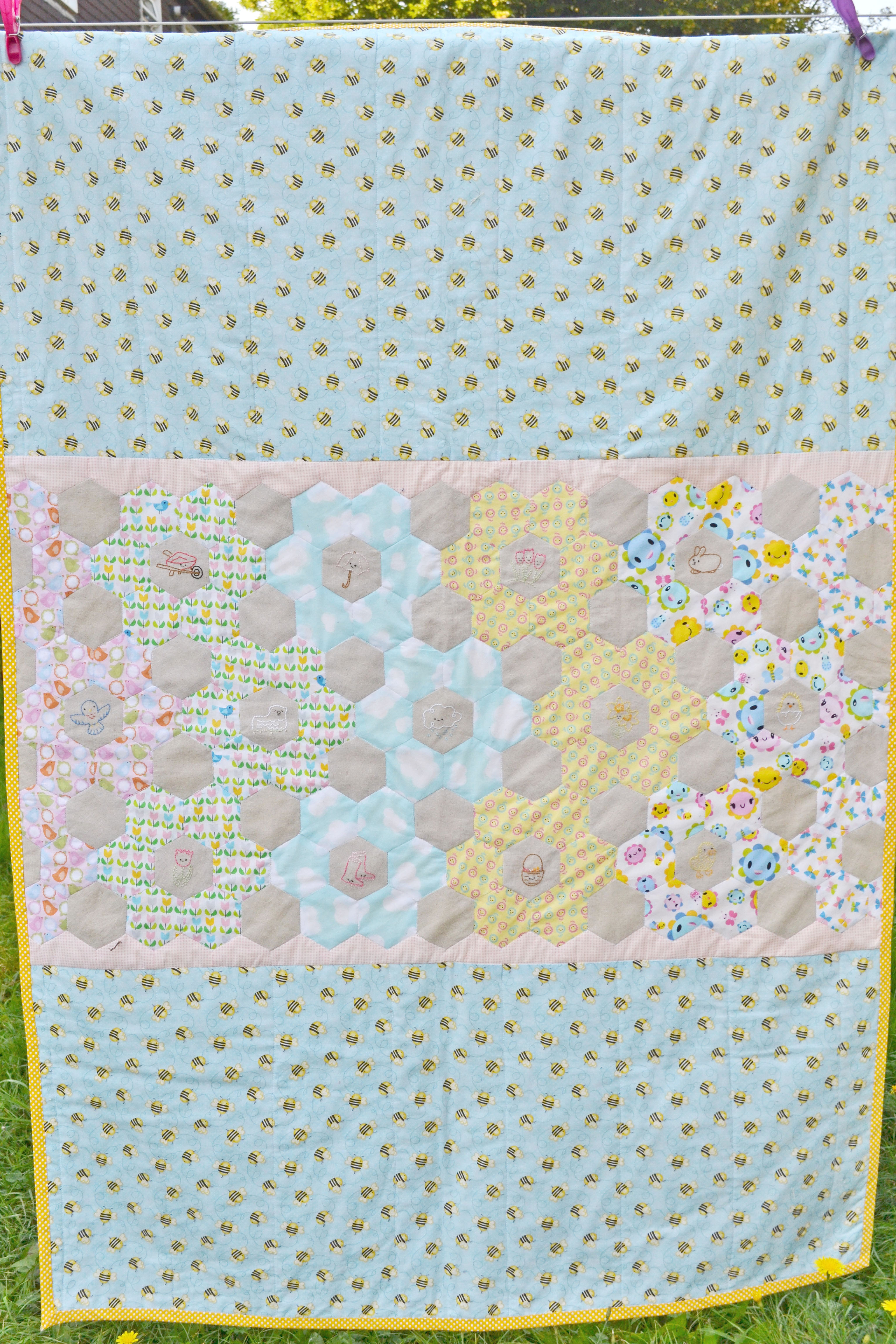 Gorgeous quilt! It’s so cute and cheery and the bee fabric finishes it off perfectly. You’ve done a lovely job of photographing it too. I really like the yellow polka dot binding. I’ve never used it on a quilt before (mostly because I’m not sure how to do the corners neatly!) so I tend to do bigger borders.