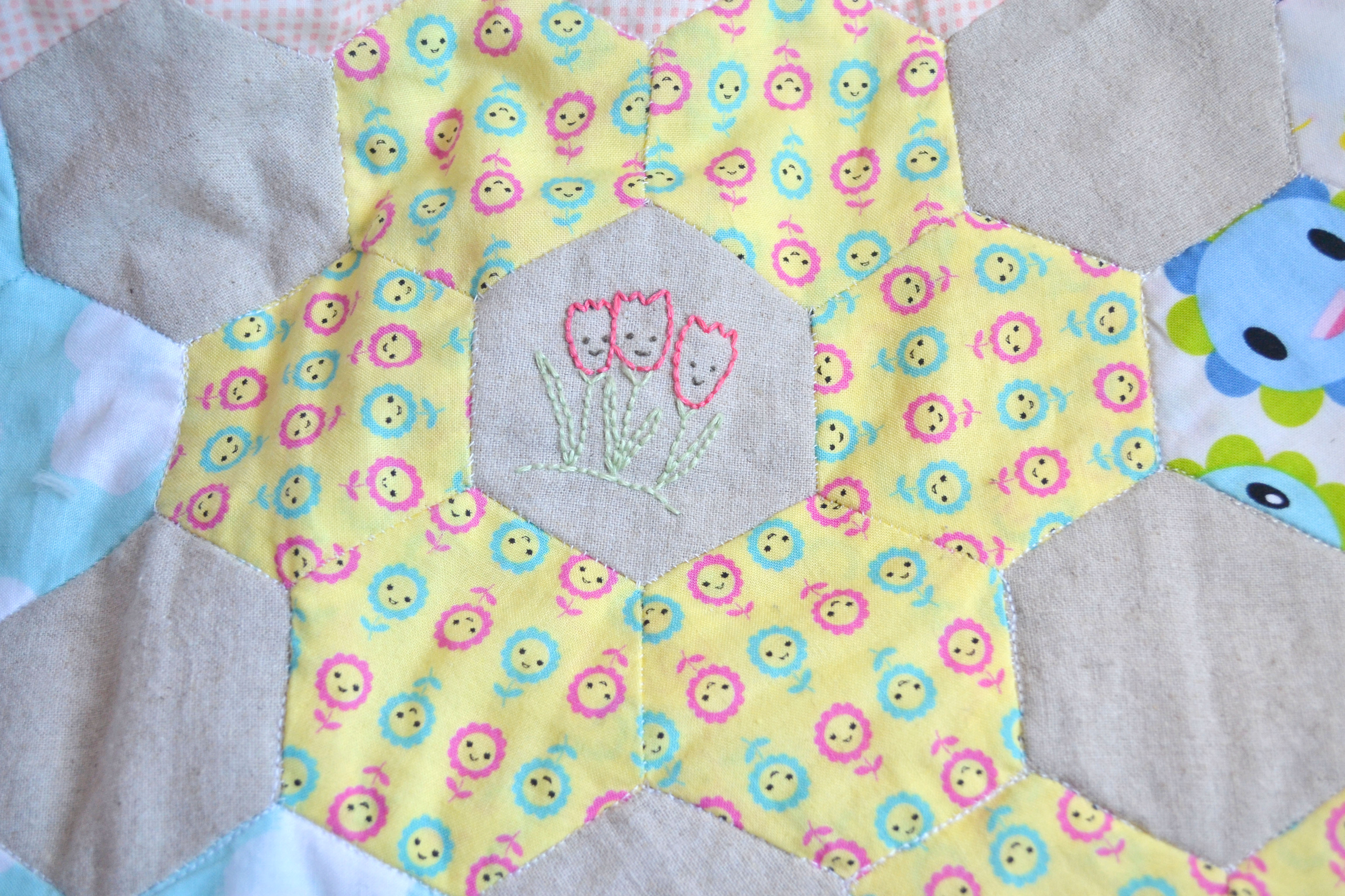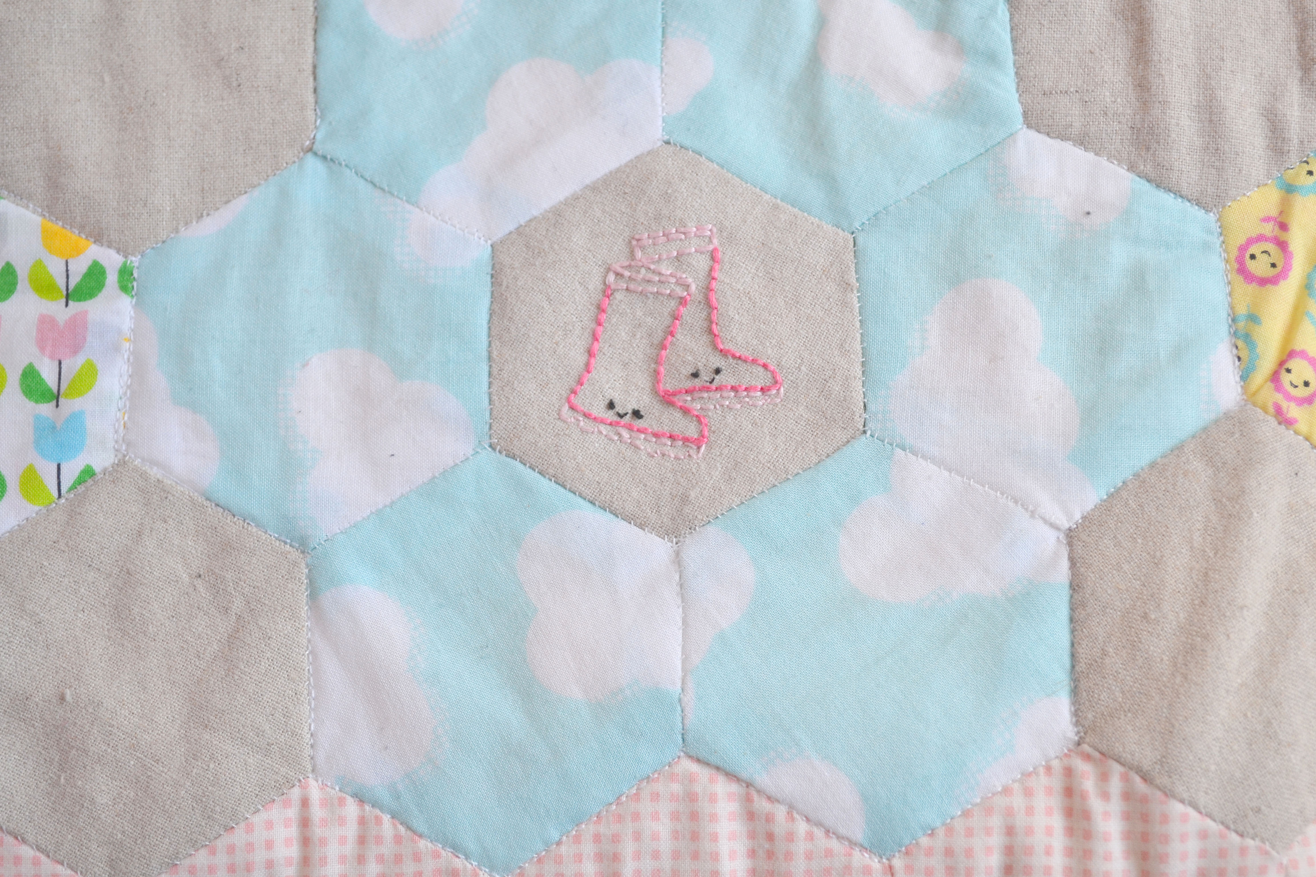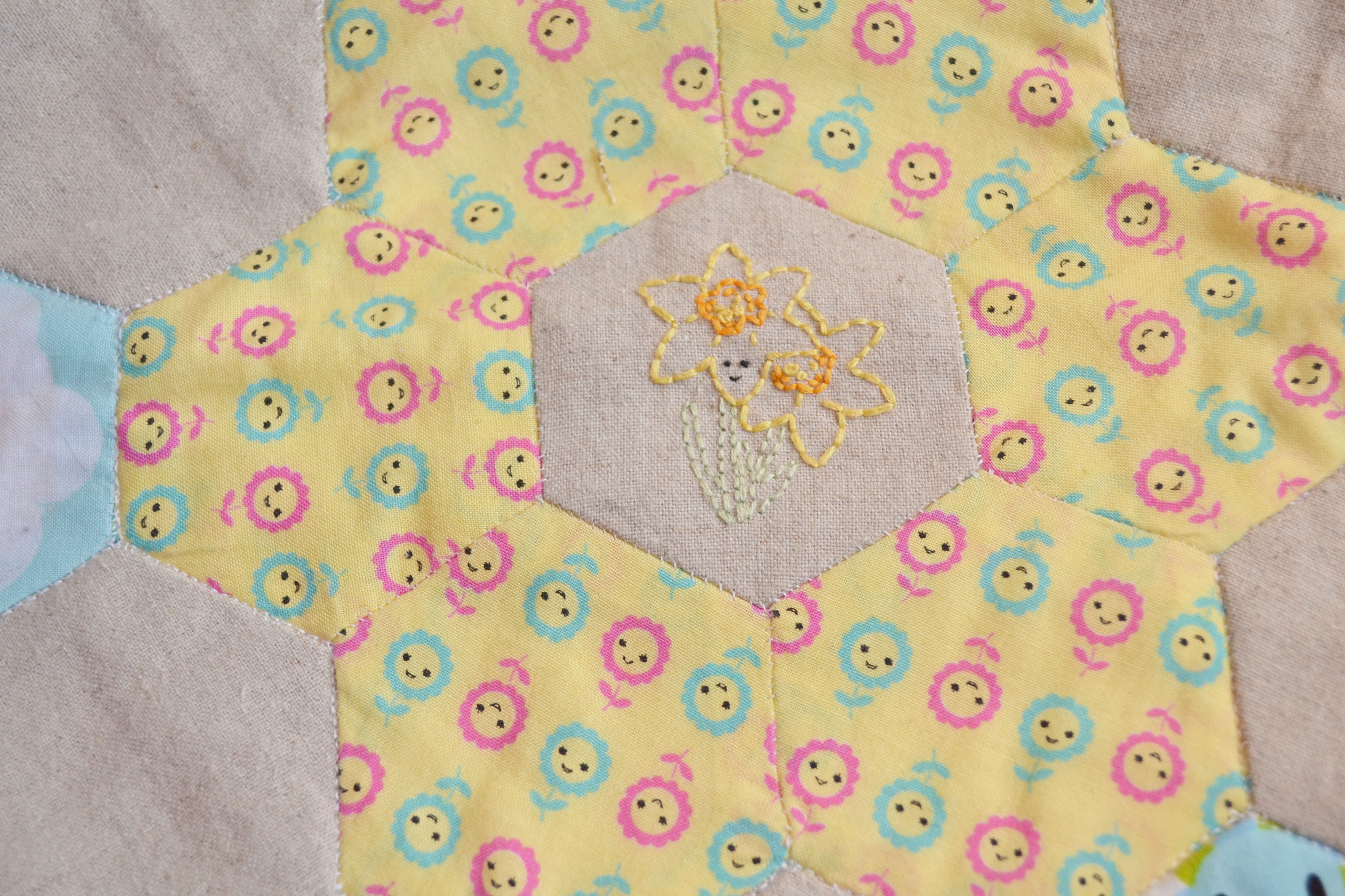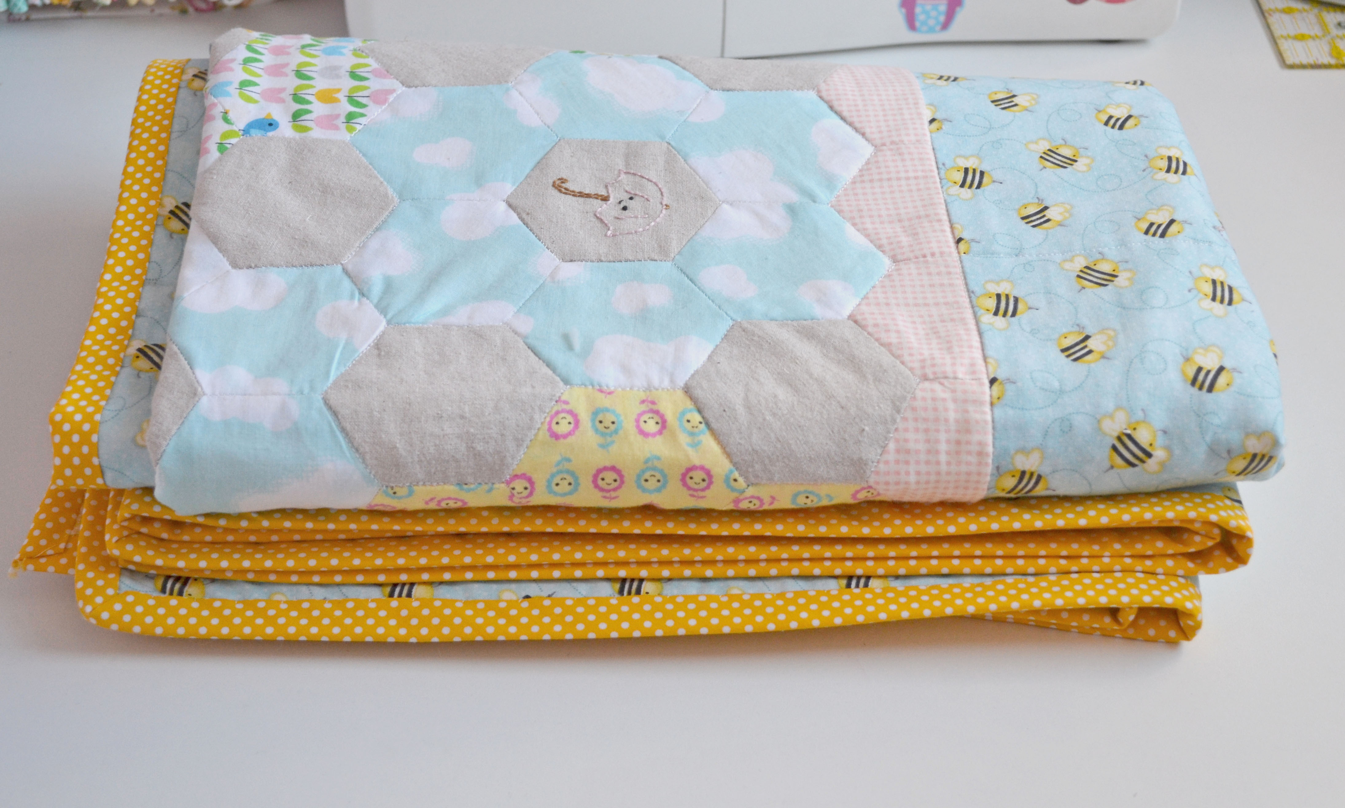 I loved this project so much! And it made me fall back in love with hexies and quilting. As I started a bit late with this stitch along I didn’t have the time to plan my fabrics but it actually all worked out ok. I used some fabrics from my stash but I did find myself making a few purchases to get it just right. The bee fabric wasn’t planned I was at my local fabric shop looking for a fabric to finish it and there it was, it was like it was meant to bee… (sorry!) Of course it had to be polka dot binding, and as it was a spring project it had to be yellow.