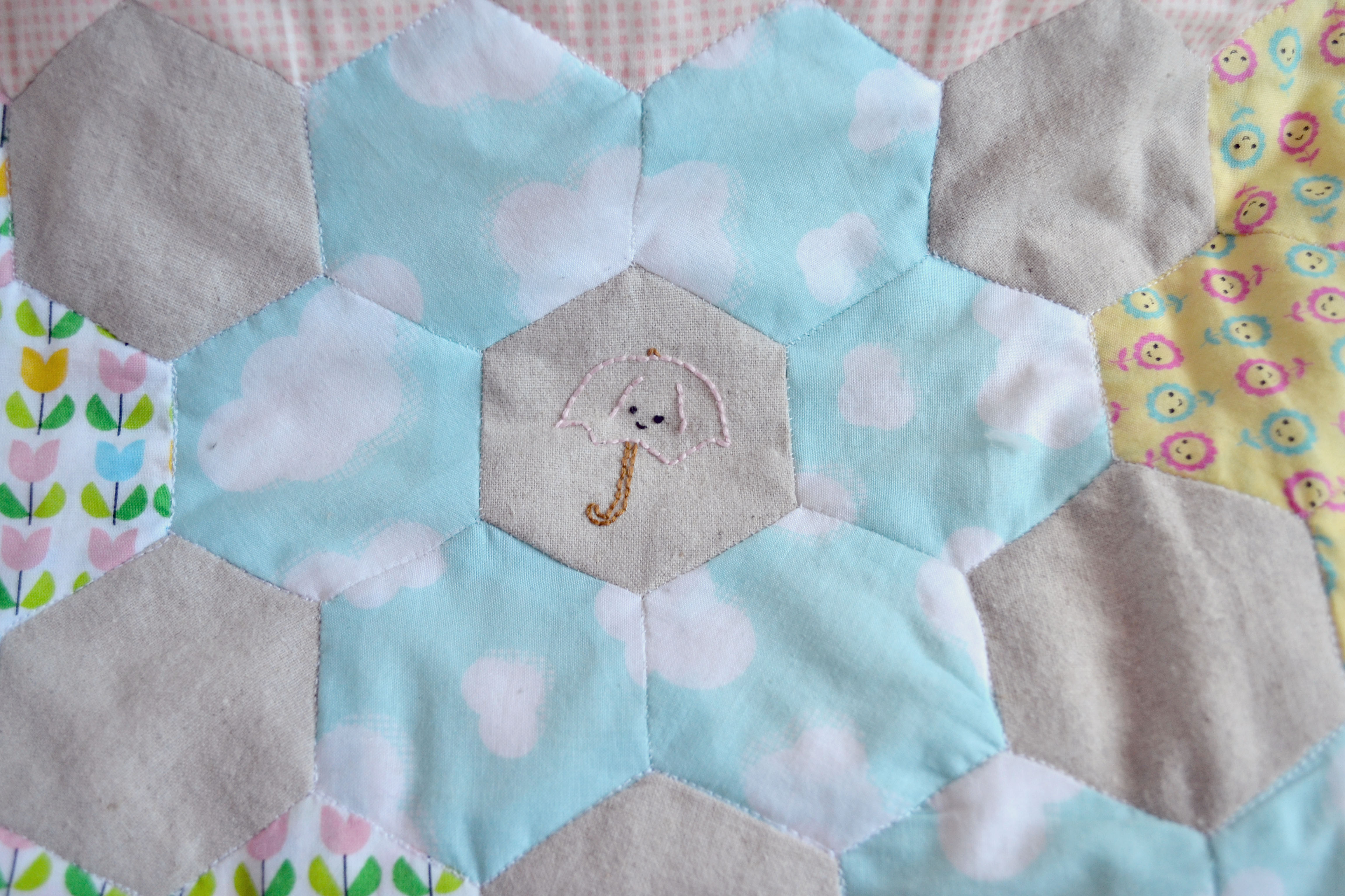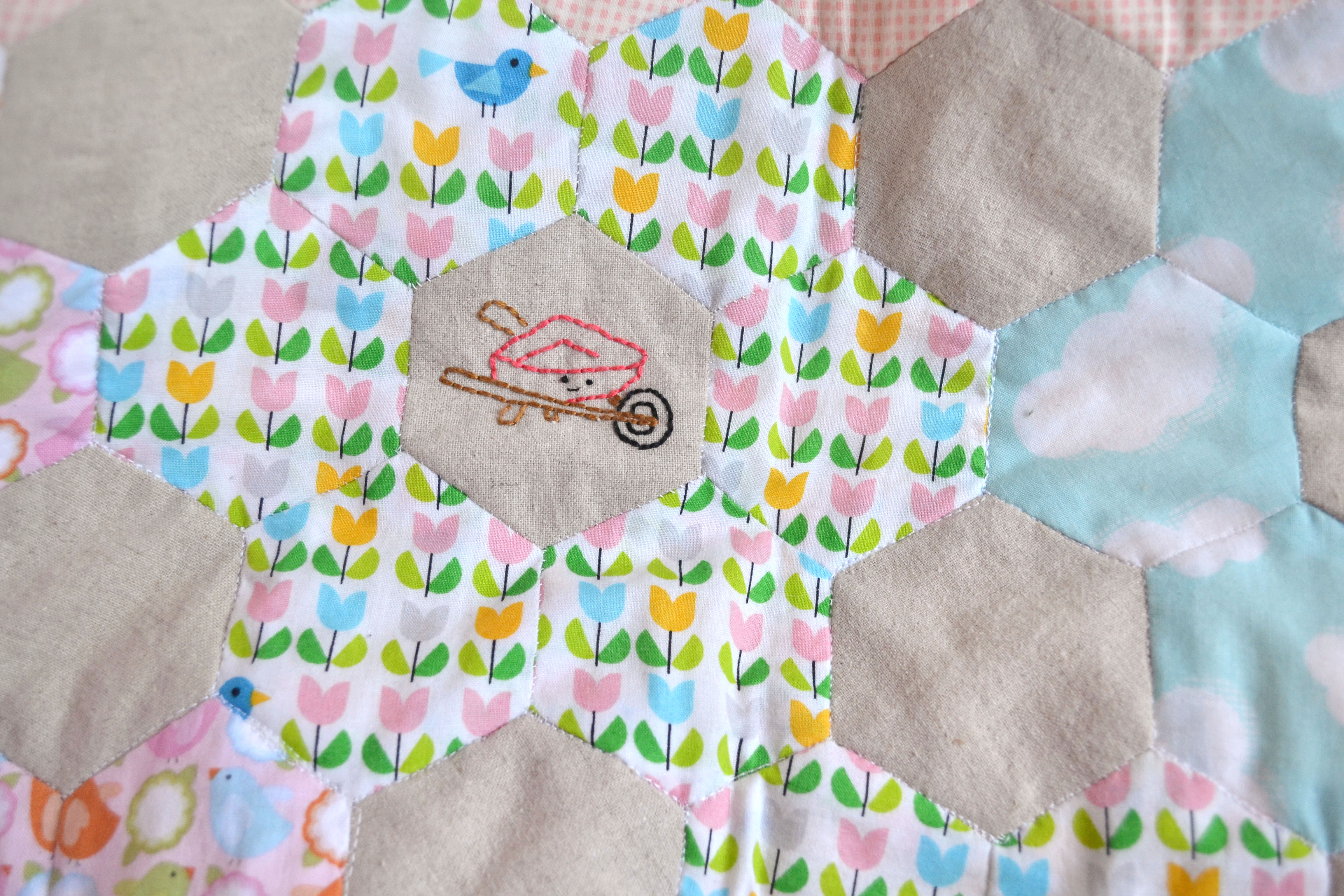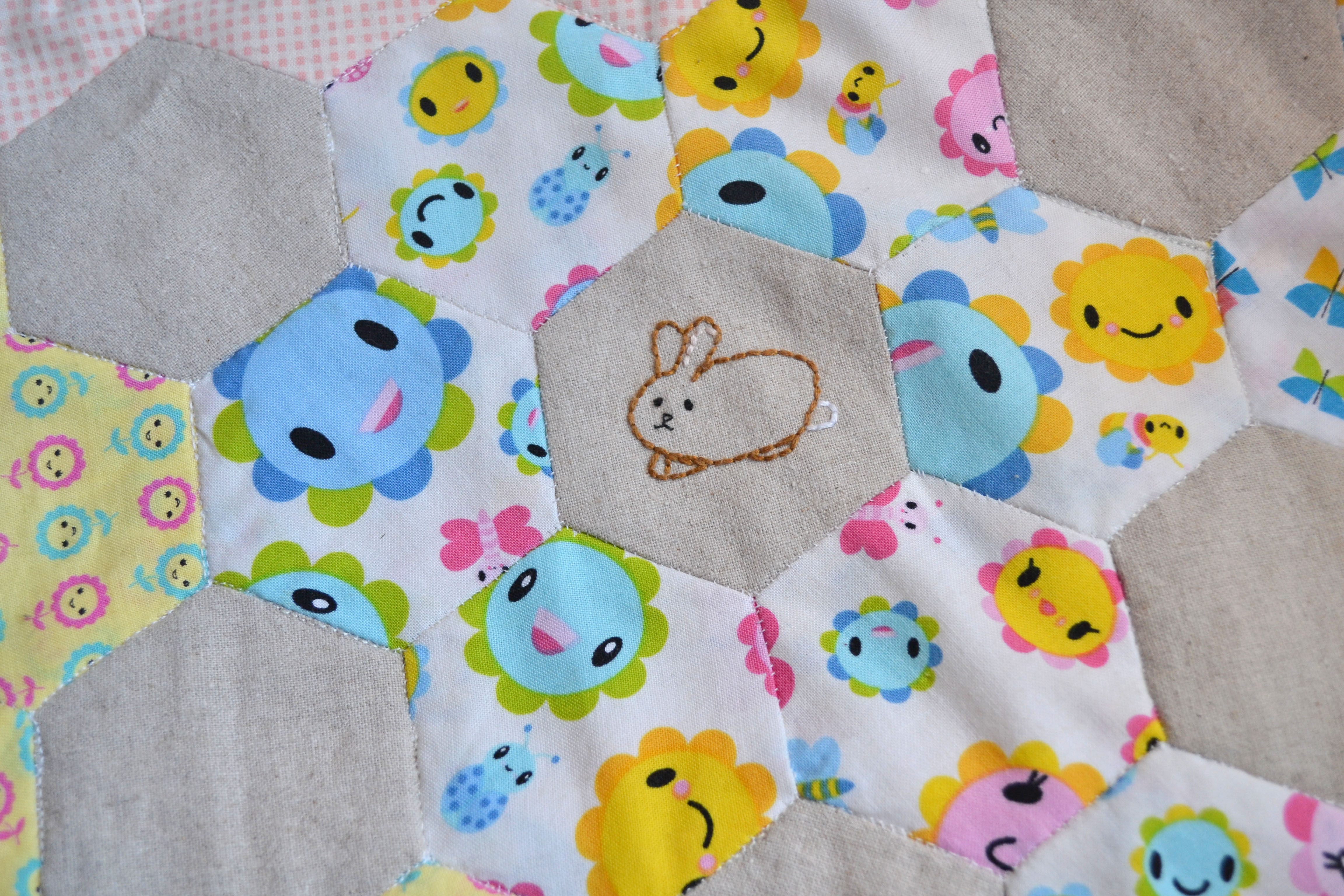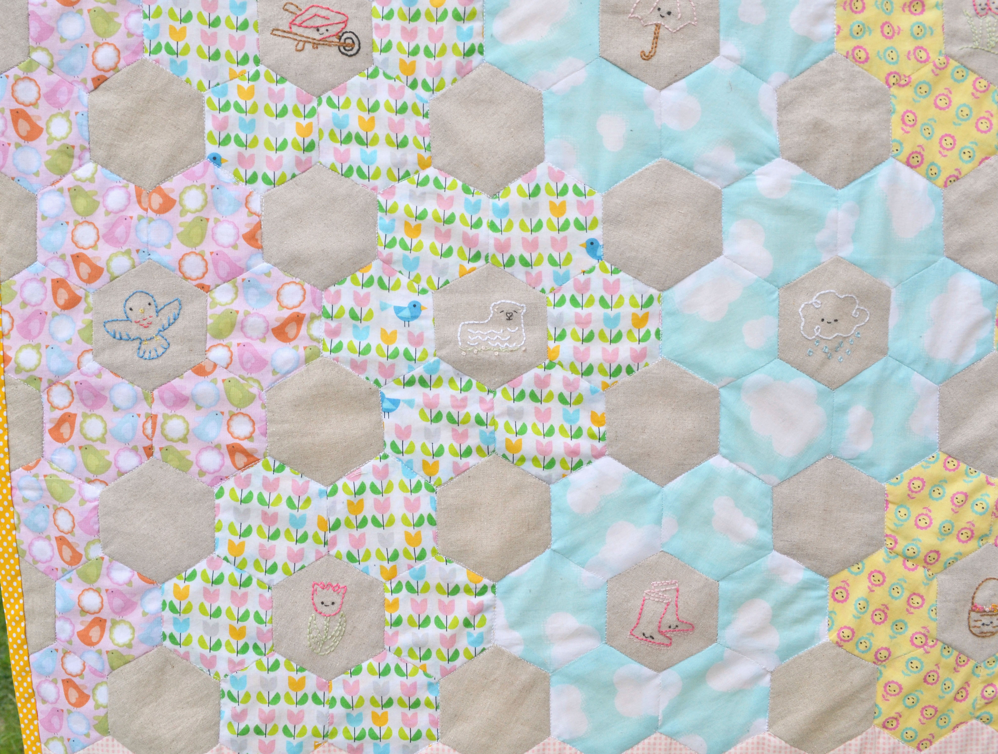 I loved this project so much! And it made me fall back in love with hexies and quilting. As I started a bit late with this stitch along I didn’t have the time to plan my fabrics but it actually all worked out ok. I used some fabrics from my stash but I did find myself making a few purchases to get it just right. The bee fabric wasn’t planned I was at my local fabric shop looking for a fabric to finish it and there it was, it was like it was meant to bee… (sorry!) Of course it had to be polka dot binding, and as it was a spring project it had to be yellow.