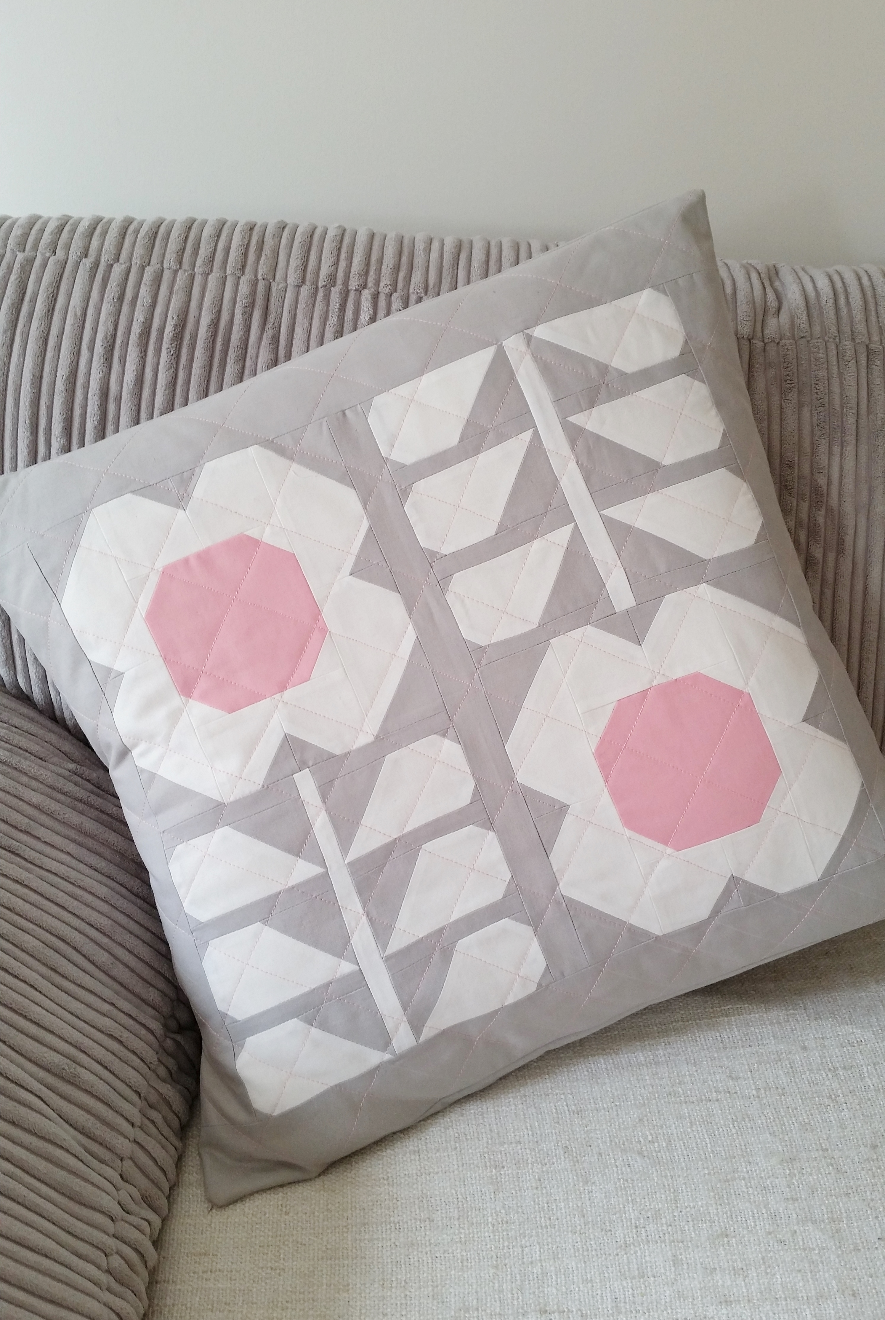 I love this design! It reminds me of Orla Kiely! The pattern was originally in bright bold colours and had 3 flowers. I decided to go with a subtle grey, white and pink to go with the colours in our lounge and made it as a cushion with just the two flowers.
