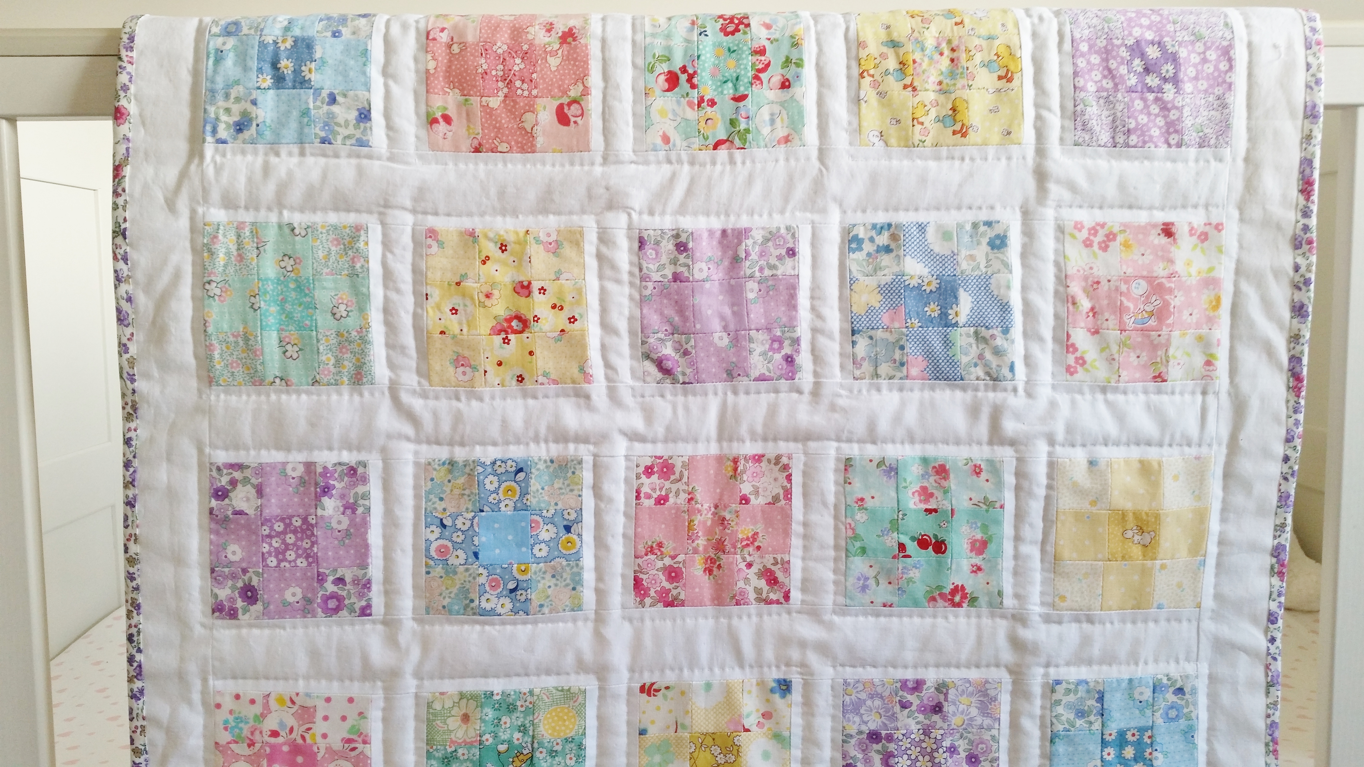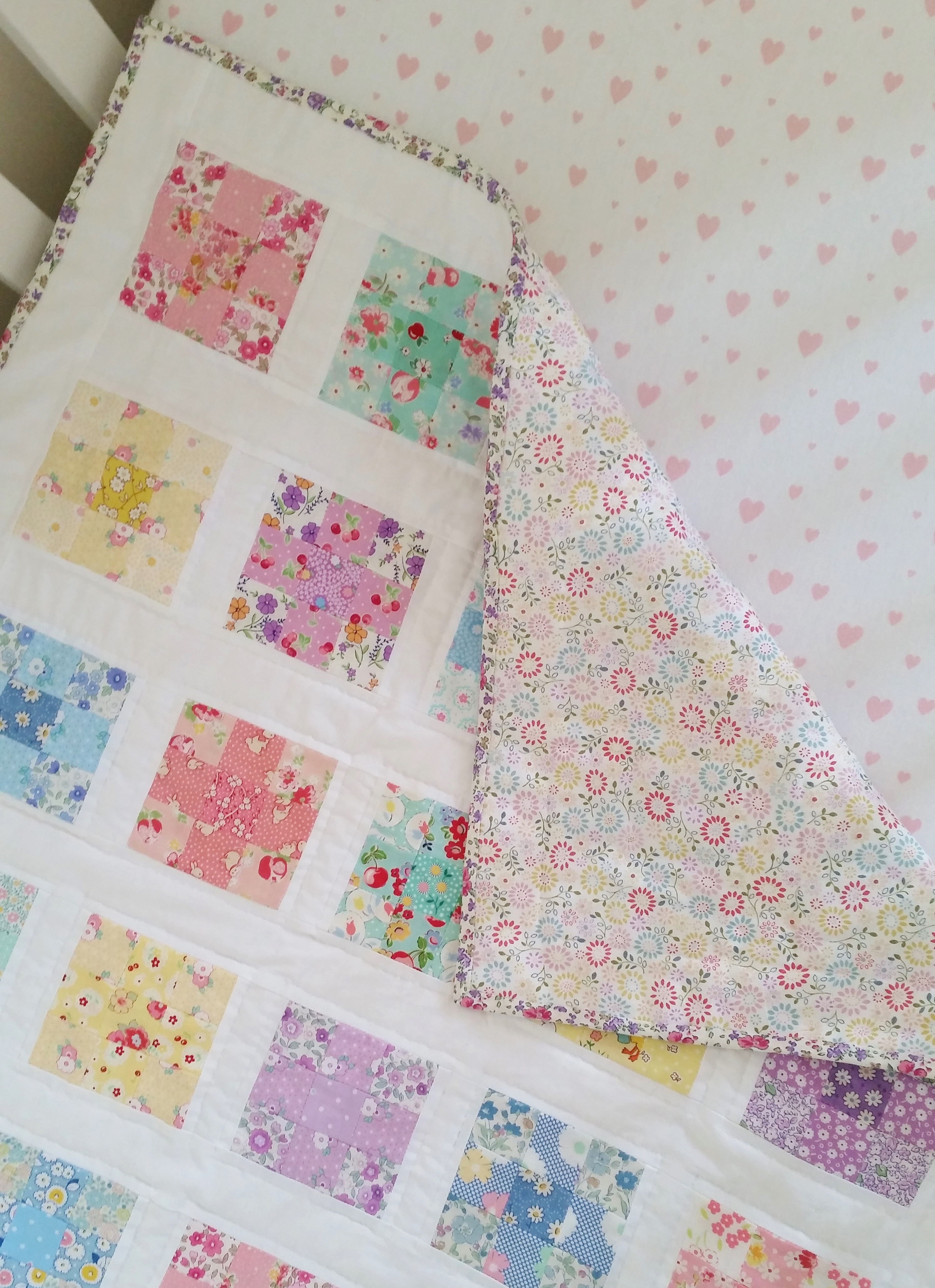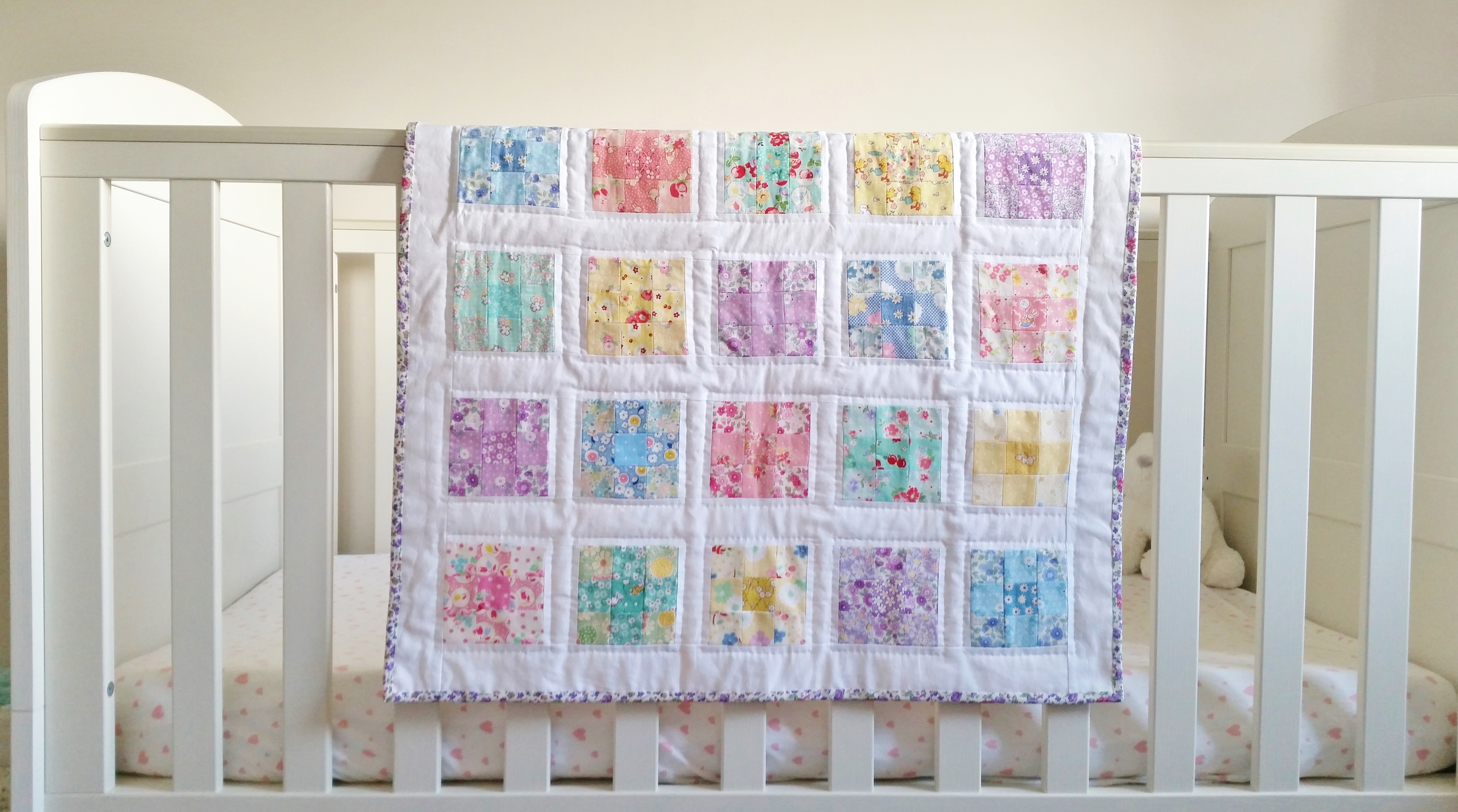 One of the reasons why was because I hadn’t settled on a design I liked, I find it hard cutting into pretty fabric at the best of times let alone when I have no set idea of a pattern. It was only when I was looking through the book Quilt Petite by Sedef Imer that I came across the perfect pattern. A combination of crisp white fabric and pretty 1930’s fabrics in a beautiful pastel rainbow of colours. I immediately knew that this was the quilt I wanted to make for Mabel.