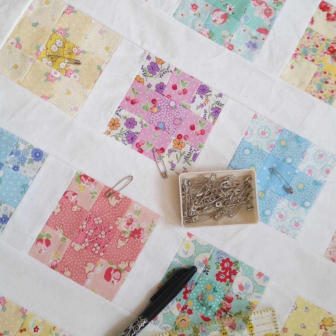 I had such fun going through all my fabrics and picking which ones I would use. I am an avid collector of 1930’s repro fabrics so had a nice little (largish) stash to look through. The pattern is actually for a mini quilt and at first I did under-estimate how many squares I would need. This took me back to the cutting board and cutting more out. It is still on the small side and won’t last her for long but it’ll certainly do as a little lap quilt for a while. In hindsight maybe I should have cut my squares bigger!