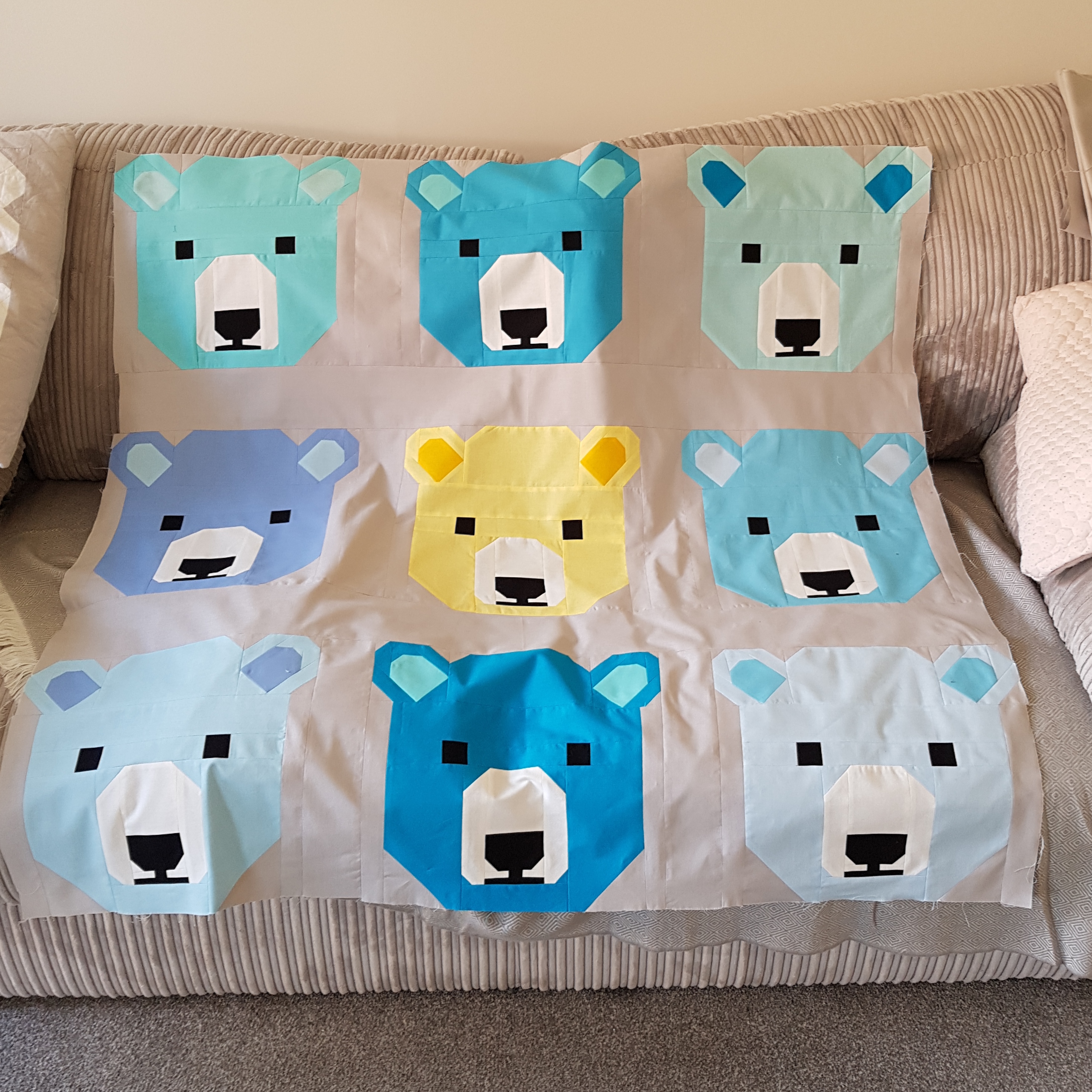 I had originally planned to do them in all shades of blue, and the original pattern was for 12 bears but as the time was now a real issue I decided to do 9 bears and make the sashing a little wider to compensate for the missing 3 blocks. As I was laying out the bears I had already finished I thought it would be perfect to have a single yellow bear in the middle. It reminded of me a sunshine shining bright.