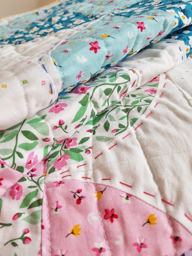 Of course I had to add some hand quilting and chose to go “Big Stitch” style. Again this was quite liberating just going with the stitching rather than trying to concentrate on getting the stitches perfect and small. I used Aurifil 12wt hot pink (#2440) and blue (#2730), unfortunately I didn’t have a purple Aurifil, so instead chose DMC floss 208 using 2 strands. I knew this already but it reaffirmed it for me 12wt is 100% easier and nicer to hand quilt with than 2 strands of embroidery floss!