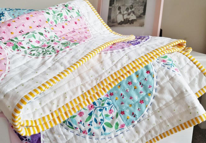 To complete the quilt, a stripey binding! I can’t remember the last time I did a quilt without one! Gotta love a stripey binding! I was especially pleased with the colour choice of this one, a sunny yellow that seems to bring the whole quilt together. What I love about using Riley Blake basics with their designer fabrics is how well their colours compliment and match the colours the designers have chosen.